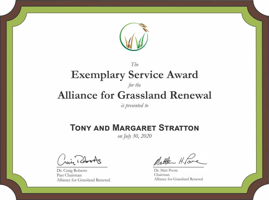 This year, Tony and Margaret Stratton received the first award bestowed by the Alliance for Grassland Renewal. The Exemplary Service Award recognizes extraordinary contribution, and the Strattons have more than earned that recognition.