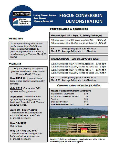 Extension specialists and seed companies can assist the replacement decision process by establishing cooperative, on-farm demos in specific regions. One example of such a demo was a collaboration between Pennington Seed and Virginia Tech Cooperative Extension (Agent Matt Booher and farmer Bud Shaver) using a conversion planting of novel fescue into one-half of a toxic pasture. The handout presented at a field day after two years of use also shows how easily both the following visual and recorded data sticky messages are demonstrated: