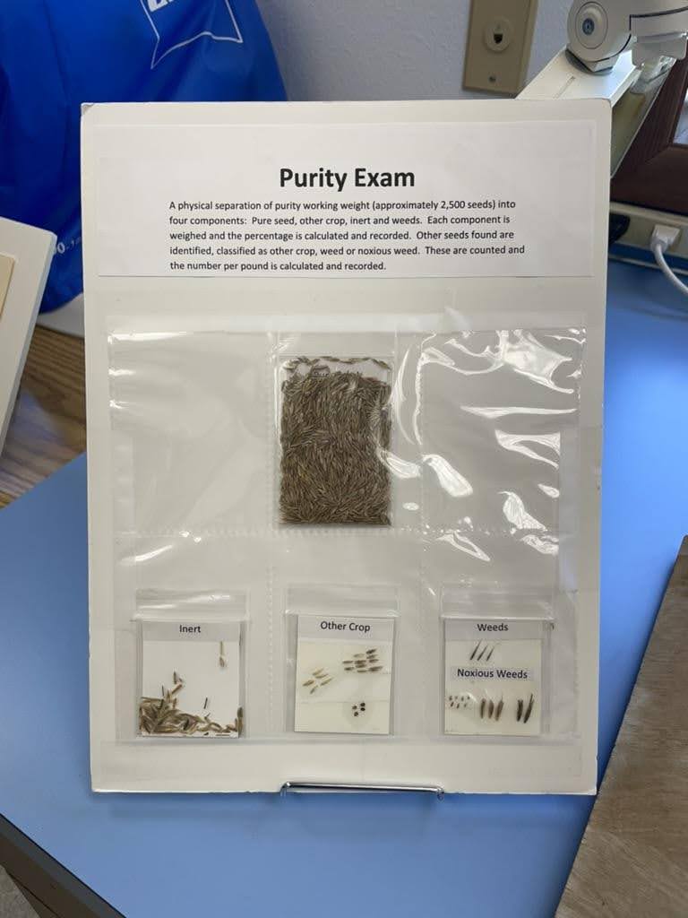 Seed certification is crucial as it ensures varietal purity, guaranteeing that farmers receive what they paid for. Labs that test the seed are part of the Association of Official Seed Certifying Agencies, which standardizes processes and results in the official blue certified seed tag that states the seeds meet State, Federal, and International seed law requirements. We visited with an Oregon Department of Agriculture field inspector and a lab that certifies seed to understand this process. Throughout the growing season, fields are inspected for weeds, and once cleaned, seed samples are taken to a lab for certification. At the lab, seed samples are visually inspected for off-type seeds, germination is tested for viable seed, and other tests are performed. However, endophyte information is not included in these tests. The Alliance for Grassland Renewal has established additional steps to guarantee endophyte quality, ensuring the endophyte is present, viable, and does not produce ergot alkaloids.