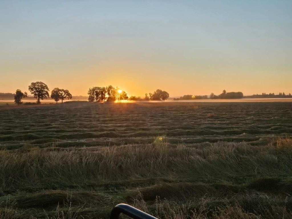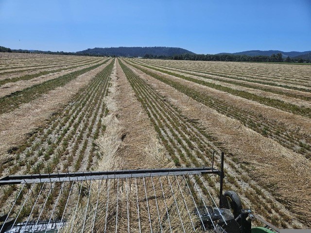The grass will lay in windrows for approximately a week to 10 days until completely dried before combining. The dried seed will thrash out more easily in the heat of the day. The combining process begins after the dew has dried and will go into the evening at a slow rate of about 2 mph.