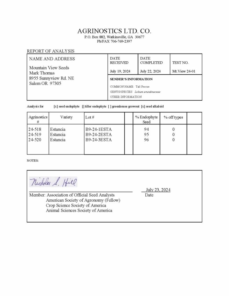 While the seed samples are being tested the commercial lots are kept in cold storage at the Mountain View Seeds warehouse in Salem, OR. The cold storage protects the viability of the endophyte and helps with breaking summer dormancy of the seed. Breaking summer dormancy will provide a more vigorous germination when planted this fall.