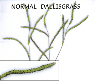 If you have Dallisgrass on your farm, you should learn to identify the fungus infected seedheads and then scout your pastures for them starting in midsummer. This is especially important when moving into a new field, or when fields are lightly stocked. Early in the infection process the seedheads develop “honeydew” that will be apparent on your pants when you walk through the stand. After the honeydew stage, the fungal bodies will develop over the next several weeks in place of normal seeds.