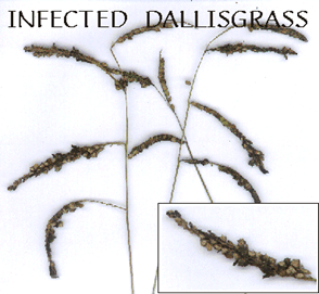 Dallisgrass Staggers occurs several days after cattle ingest a significant amount of dallisgrass seedheads infected with an “ergot‑like” fungus called Claviceps paspali. The seedheads typically are infected with the fungus in late summer and early fall, as the seedheads age. Rather than flat ear drop shaped seeds on the heads, the infected heads have gray to black swellings that have a sticky sap material on them.. Some observers say it looks like little popcorn (see photos of normal and infected seedheads). Sometimes the heads may be orange or red colored. Usually, not all the herd is affected, and it appears that it occurs when some animals develop a preference for the tips of the seedheads. This problem can also occur in horses, and presumably any other mammal that might consume the infected seedheads.