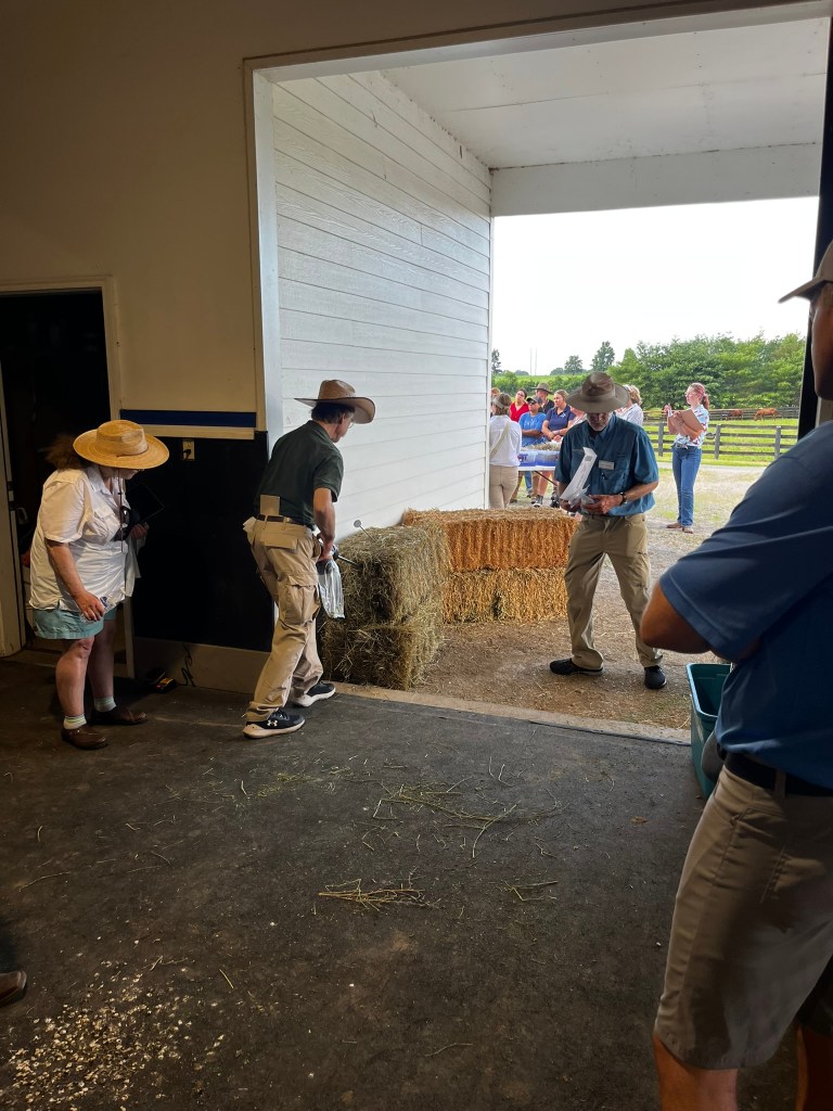 The program began with a short farm tour and a stop at a broodmare pasture with a long history, as told by Extension Specialist Krista Lea. In 2023, the pasture was found to contain KY 31+ toxic tall fescue and was targeted for renovation. That fall, the farm applied a targeted herbicide to kill just the tall fescue, and then seeded a novel endophyte. Testing the following spring still found high levels of the toxic ergot alkaloid ergovaline, suggesting that the kill and re-establishment process has not been effective. In the fall of 2024, the pasture was again targeted for renovation, but this time, a complete kill was utilized. Two applications of a killing spray followed by no-till seeding of a novel tall fescue + orchardgrass + KY bluegrass were successfully completed. The results, as assessed by the UK Horse Pasture Evaluation Program found over 85% of the pasture now contained tall fescue and orchardgrass, and ergovaline levels were below the detectable limits. Field day attendees were able to see this pasture first hand, ask questions and even received a quick lesson on identifying tall fescue and orchardgrass.