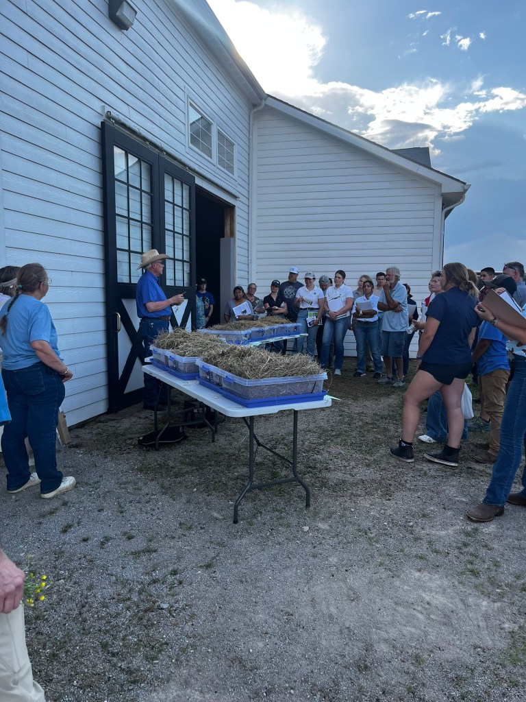 After dinner, Dr. Ray Smith and Dr. Bob Coleman offered educational sessions on hay testing and feeding. Dr. Smith demonstrated the proper way to take hay samples and how to correctly use a soil moisture meter and had a selection of hay probes that participants could try out on some bales of hay. Dr. Bob Coleman taught those in the crowd how to interpret hay samples. He provided his own hay samples that they were able to sift through, so they could determine good quality hay versus poor quality hay.