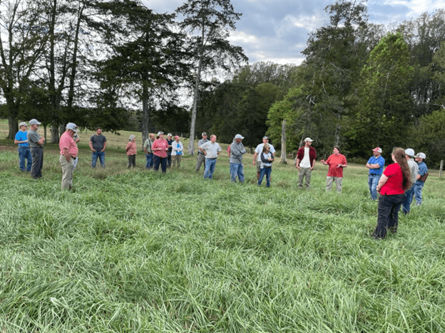 The event, organized by J.B. Daniel (NRCS) and Matt Booher (NRCS), drew about twenty people from across the region. Out in the field, Ronnie shared what led him to take the plunge into pasture renovation. After attending several educational meetings, he was convinced by data showing improved average daily gains and reproductive performance in cattle grazing the novel endophyte fescues. “The cows just do better,” he said plainly—and the thriving stand behind him provided the proof.