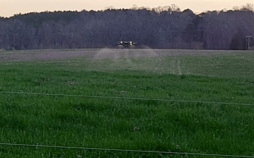 I was visiting with my friend Preston Cave of PAC Aerial Applications, LLC at the NC Cattlemen’s Association Meeting in February and he mentioned he would be down our way in March and would have some time to spray some pastures. A couple of us went together to make it worth his trip, and we were scheduled for this week. Preston is a young entrepreneur who has found a great opportunity doing custom spraying and seeding by drone. This technology has only been around for a short time, but it is rapidly being adopted across agriculture.